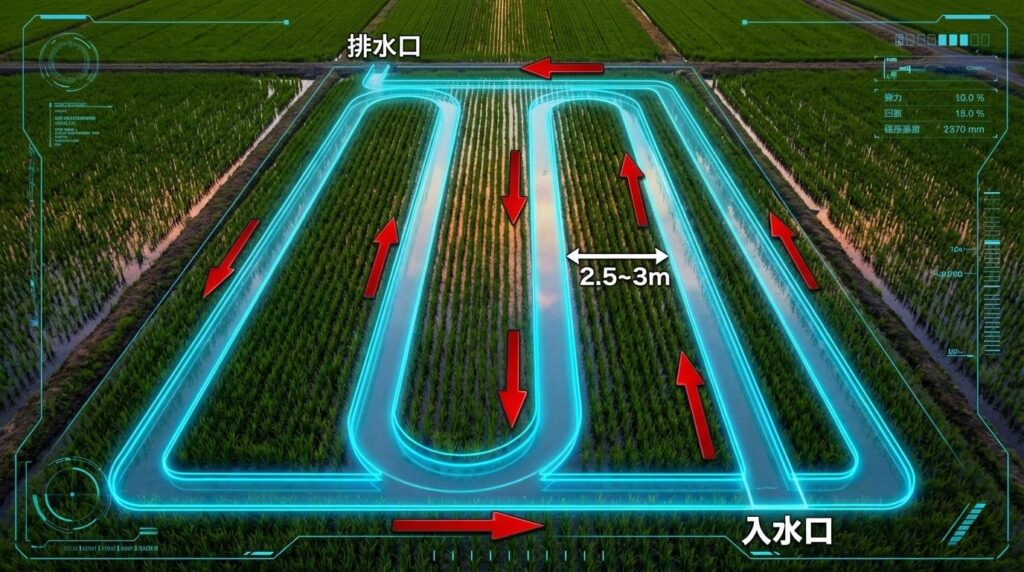 溝の末端は、必ず水口(入水口)と水尻(排水口)の両方に接続します。田んぼ全体の水が1本の流れで抜けるような「一筆書き」のイメージを持つと失敗しにくくなります。