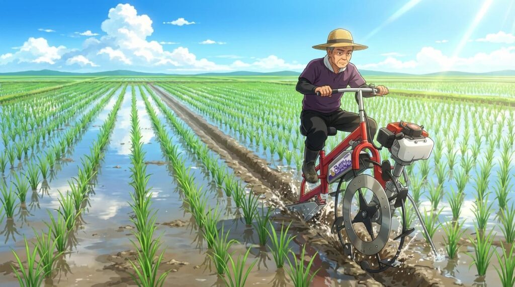 溝切りとは、田んぼの土の表面に溝を掘って「水の通り道」をつくる作業のことです。よく田んぼの中を自転車のようなものに乗ってなにかしている人を見ませんか?それです。そして中干しとは、田んぼの水を抜いて土を乾かし、土壌と稲の状態をリセットする作業を指します。