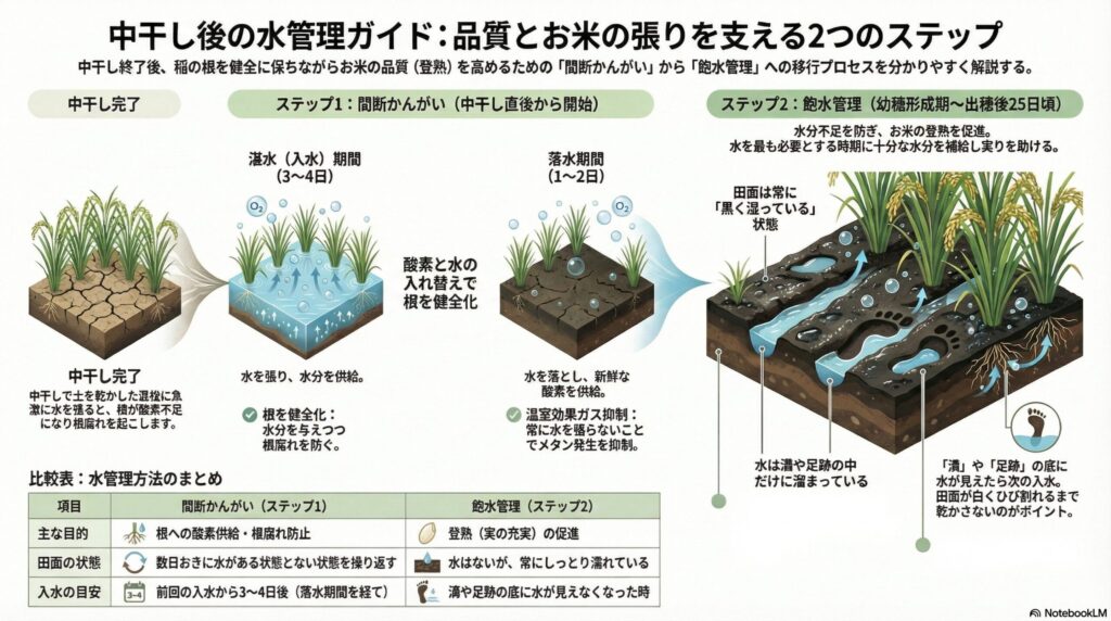 中干しと間断かんがいによって土壌が落ち着いた後、幼穂形成期から出穂の約25日後頃(稲刈り前)まで徹底して行われます。つまり中干し後は下記を徹底しましょう。