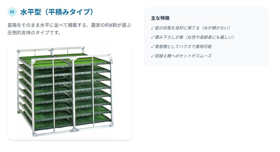 - ✓ 水平型が人気。育苗棚兼用・扱いやすさ・苗を傷めない点で優れている