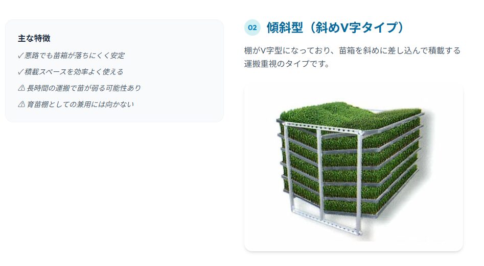 棚がV字型になっており、苗箱を斜めに差し込んで積載するタイプです。