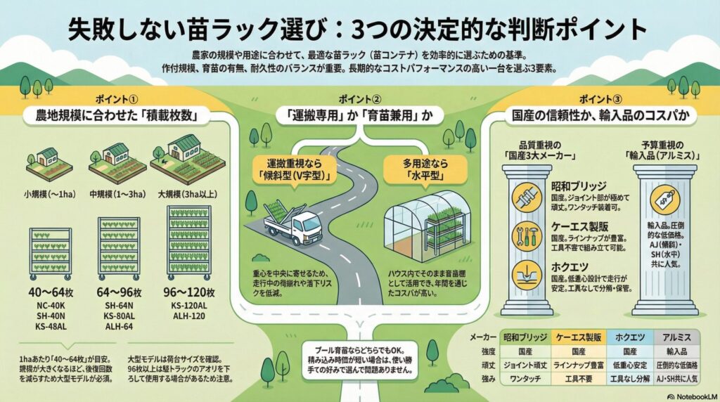 「アルミ製の水平型苗ラックを、農地規模に合った積載枚数で選ぶ」