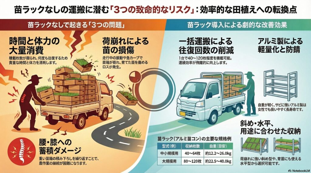 苗ラックなしで苗箱を軽トラで運ぶ場合、荷台に平積みできる枚数はかなり少なくなります。枚数が多い農家ほど何往復もの運搬が必要になり、田植えシーズンの貴重な時間と体力を消耗してしまいます。