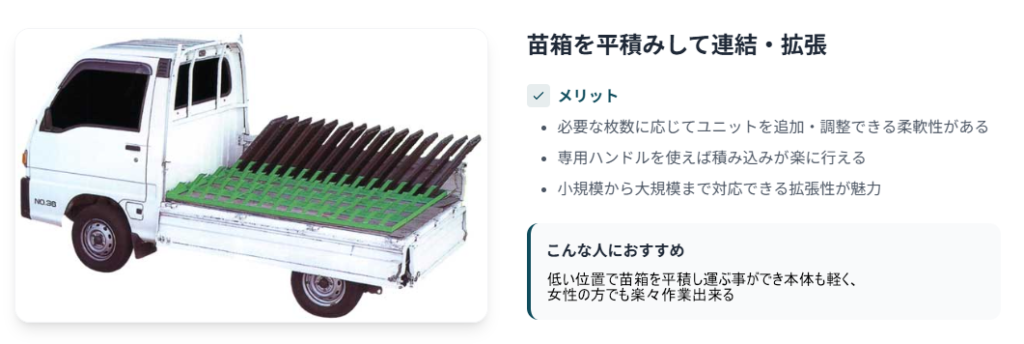 苗箱をそのまま積み上げると、走行中の振動や急カーブで崩れることがあります。せっかく育てた苗を傷めてしまうのは、農家にとって最も避けたいはず。