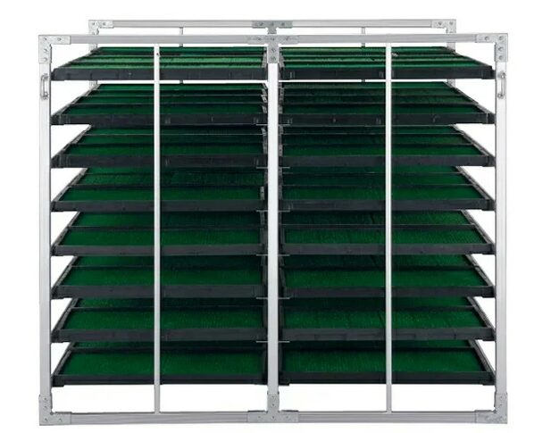 ホクエツの「LNシリーズ」に代表される、苗箱を平積みして連結・拡張できるユニット式のタイプです。ただこちらはスチール製になります。