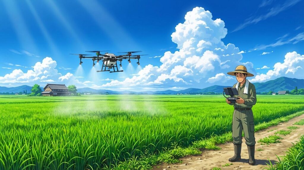ドローンを使えば、1haあたり約15〜30分で散布が完了します。従来の動噴作業と比較して所要時間は1/4〜1/8です。遠隔操作のため薬剤への接触・吸入リスクも大幅に下がります。