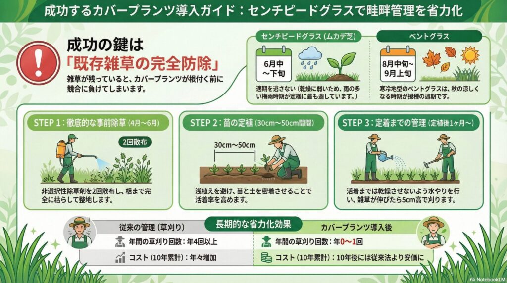 カバープランツ導入の具体的な手順(センチピードグラスの場合)