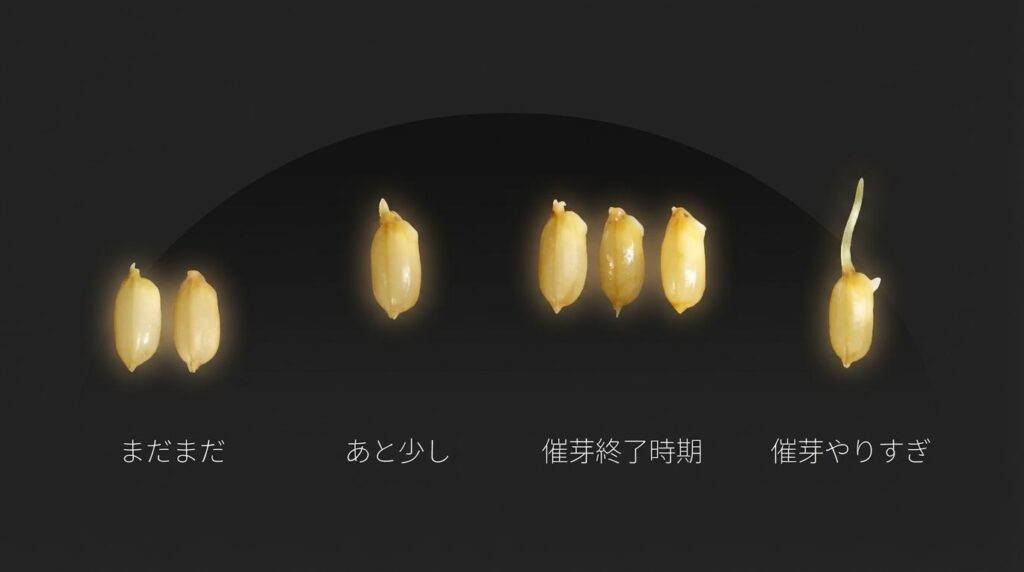 実は催芽の失敗パターンには共通点があります。温度が高すぎた、水に浸けすぎた、芽を伸ばしすぎた……。逆に言えば、「温度」「水分」「タイミング」の3つを押さえれば、催芽は誰でも成功率を大幅に上げられる技術なんです。