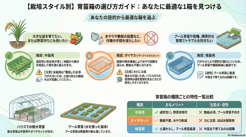 の3点を軸に判断するのがコツです。とくに高密度播種苗移植栽培やプール育苗を行う場合は稚苗用がおすすめ、省力化を重視するならダイヤカットが有力候補であることを覚えておきましょう。