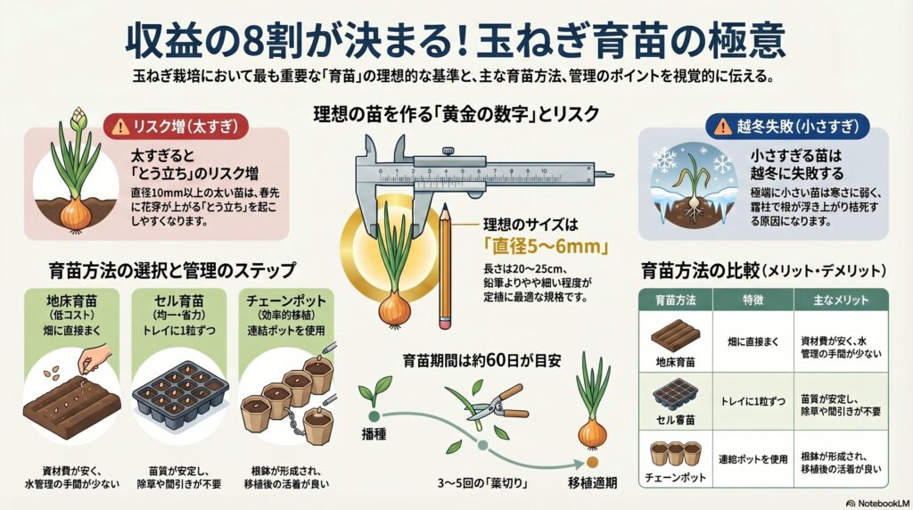 - 育苗では苗の直径5〜7mmが基準。太すぎるととう立ち、細すぎると越冬不良