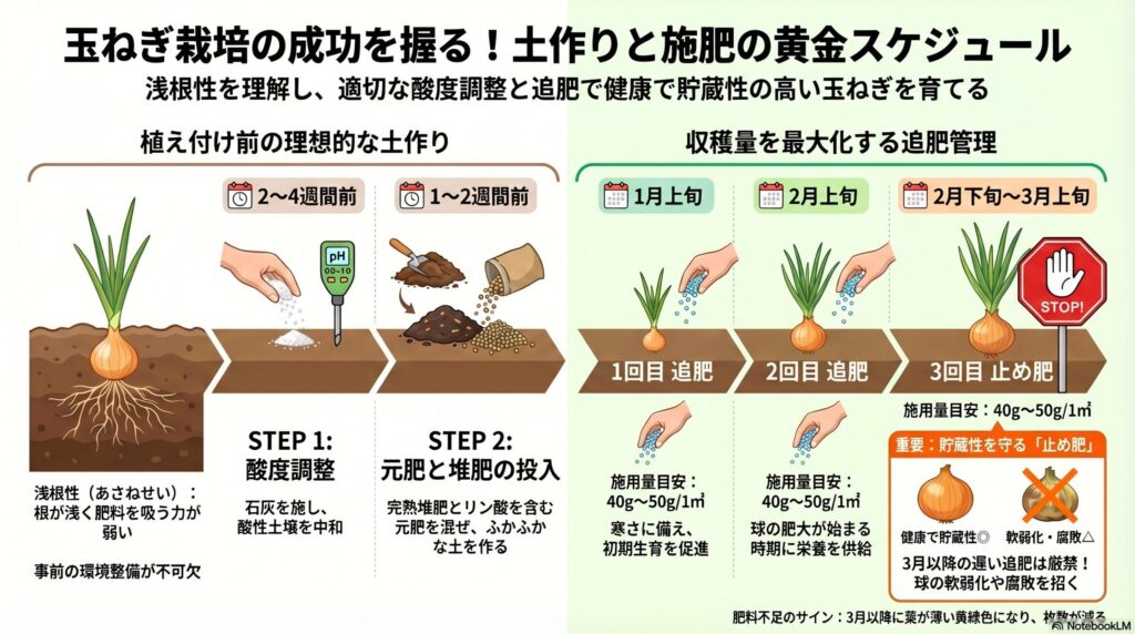 注意してほしいのが、4月以降は絶対に追肥しないというルールです。収穫間際の追肥は、貯蔵中の腐敗や品質低下を招く直接的な原因になります。4月に追肥して秋に全部腐ったという失敗談を聞いたこともあります。