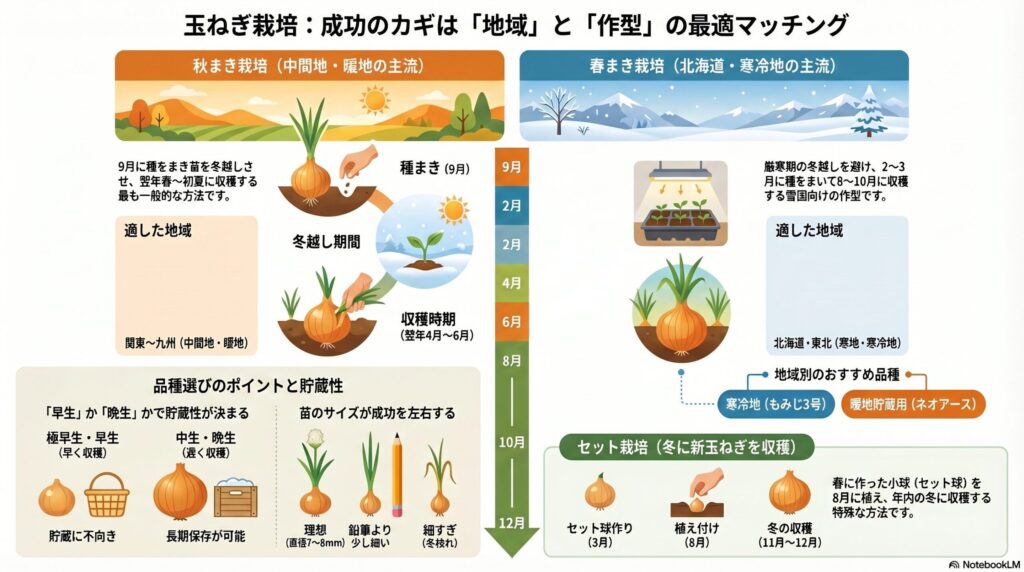 玉ねぎ栽培の第一歩は、自分の地域と出荷時期に合った作り方と品種を選ぶことです。ここを間違えると、いくら管理を頑張っても思った結果が出ません。